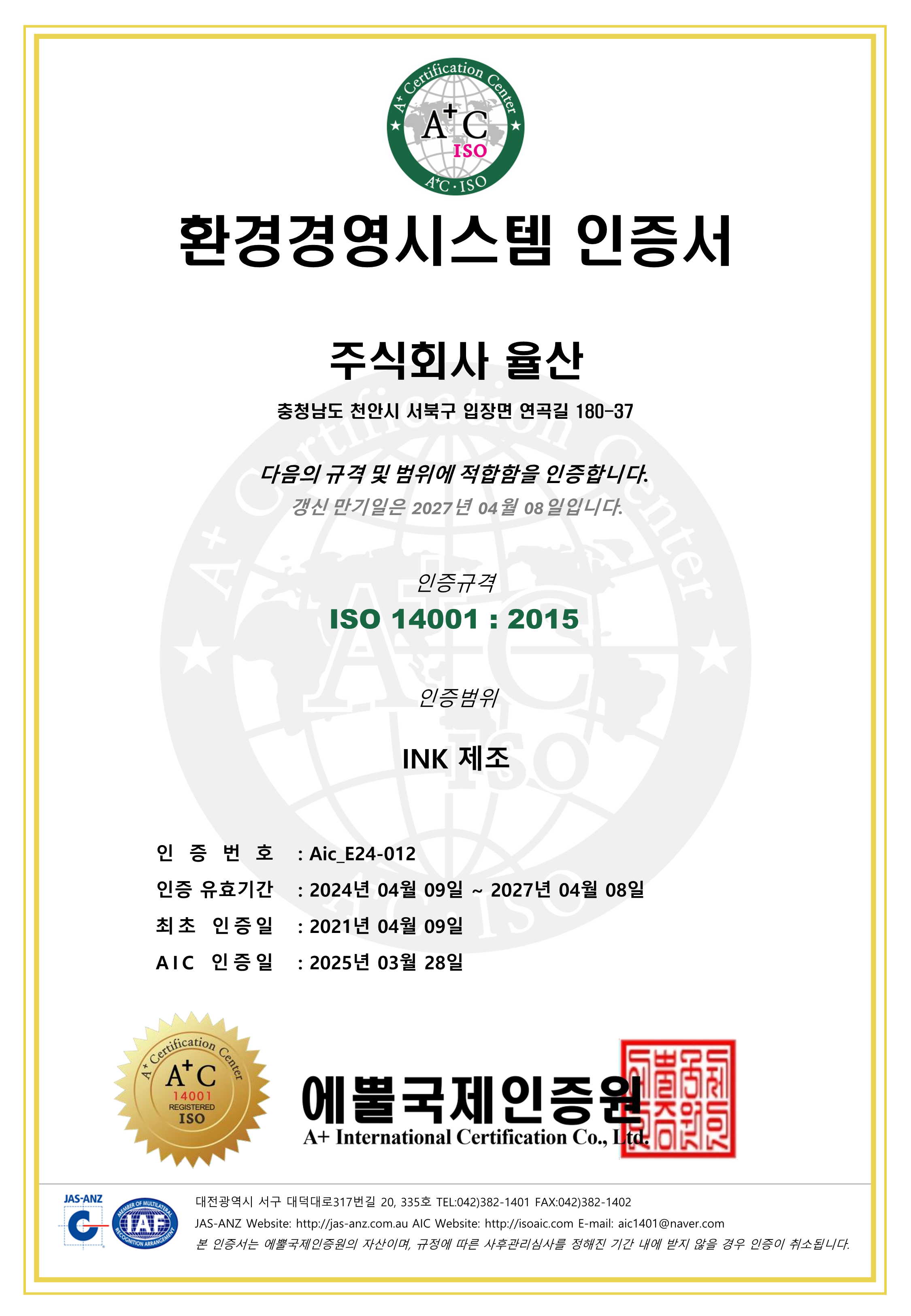 (주)율산, ISO 14001 환경경영시스템 인증 취득